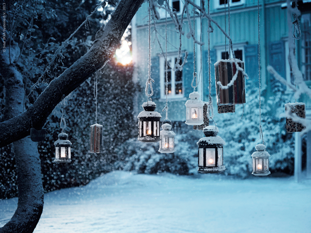 Zeige zwei traumhaft schöne Bilder von einem verträumten Winterland in einem verschneiten Garten. Dekoriert für einen Glühweinplausch mit Ikea Produkten. So wie man sich den Winter vorstellt… still, verschneit und romantisch. Die Idee mit den aufgehängten Laternen werde ich für meinen Garten übernehmen. Warum nicht das Apéro draussen gestalten, mit heissem Glühwein und feinem Gebäck. Schnee inklusive.