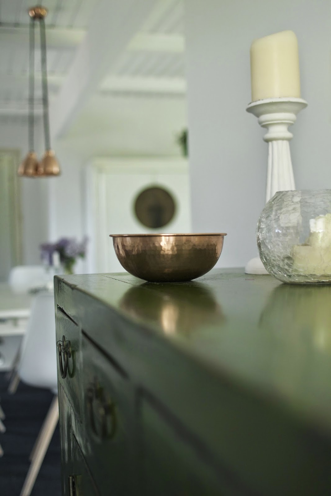 Die Materialwahl und die Farbe weiss hat das Haus grundlegend verändert. Es wirkt viel harmonischer, heller, ruhiger und sieht einfach toll aus! Die Einrichtung ist eine Mischung aus alt und neu, modern und shabby chic mit einem Asiatischem Touch. Die Kupfer Details, die Pflanzen und die Tierfelle geben dem Raum auch die nötige Wärme, als Ergänzung zum vielen weiss. Ein gutes Beispiel von einem sehr gelungenen Umbau!