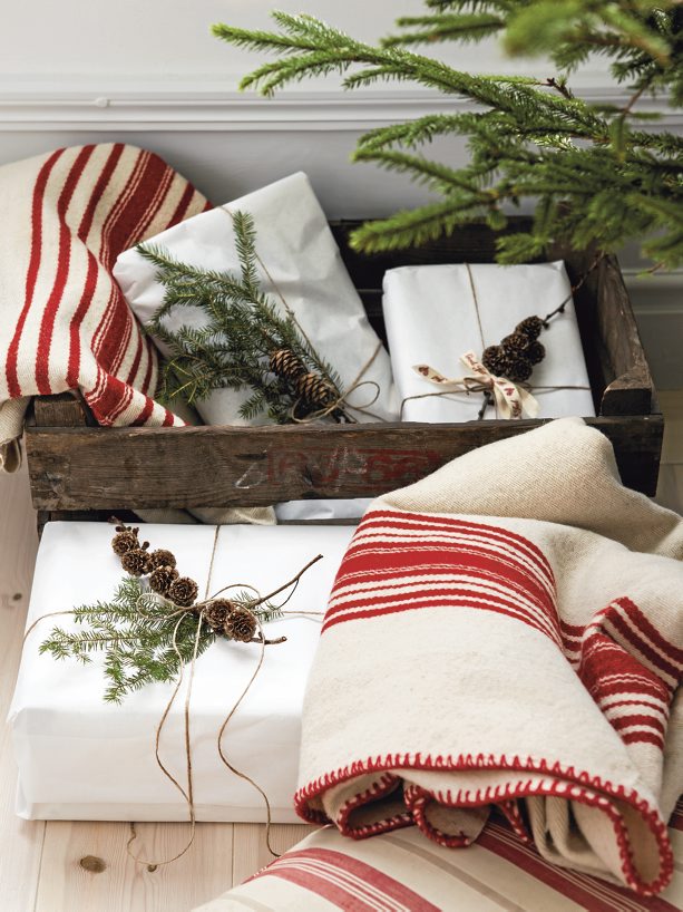 Fast so wichtig wie das Geschenk finde ich das Einpacken. Schönes Papier, glitzernde Bänder, Schachtel und schmucke Kärtchen machen aus dem Weihnachtsgeschenk ein kleines Kunstwerk. Eine Auswahl an Verpackungsmaterial gibt es reichlich in den Läden heute. Meine Favoriten dafür sind Interio (mit einem riesigen Auswahl) oder auch Ikea zu erschwinglichen Preisen. Sogar das Klebband gibt es heutzutage mit dekorativen Mustern. Manchmal ist aber auch weniger mehr und es braucht nur einen kurzen Waldspaziergang um schönes Material für die Dekoration zu finden. Äste, Blätter oder Tannzapfen eignen sich bestens um ein schönes Geschenk zu schmücken.