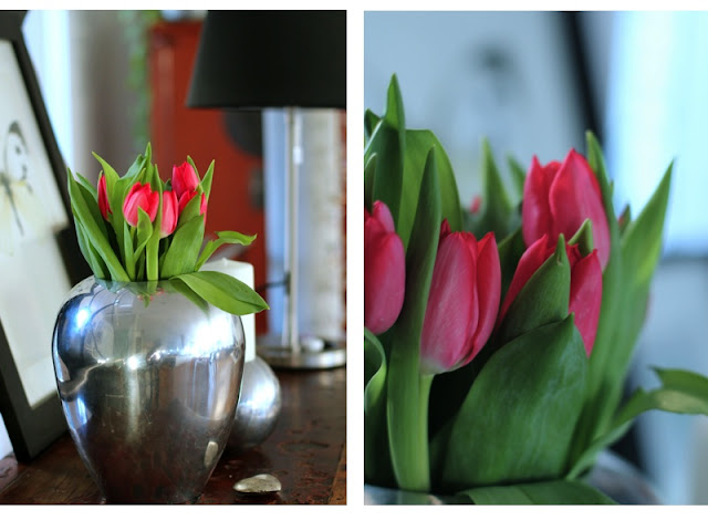 Hier habe ich ein Stilleben mit runden und eckigen Formen erstellt (Gegensatz). Die roten Tulpen wiedergeben die Farbe der Kommode und die Materialen harmonieren miteinander (Metall und Holzkommode). Farben Schwarz, weiss, rot und Metall (nicht zuviele Farben verwenden, wirkt dann unruhig).