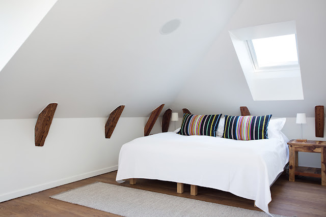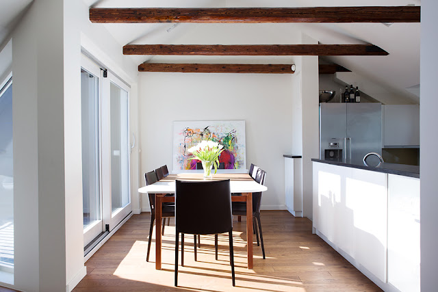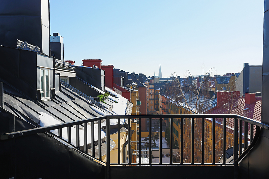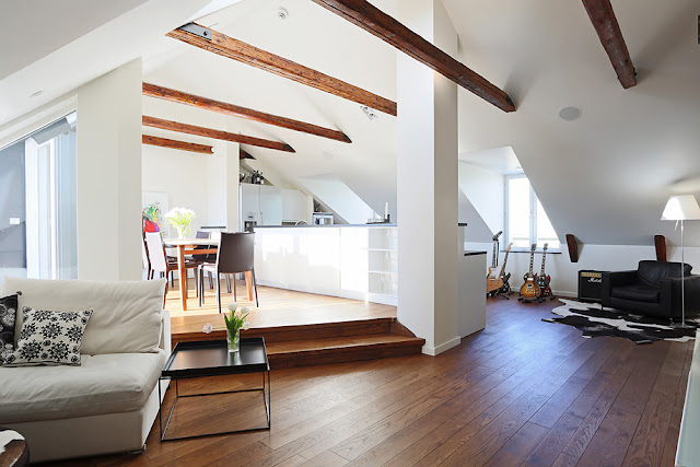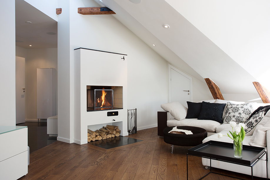 Wohnen unter dem Dach hoch über Stockholm City ist bei dieser Wohnung angesagt. Hell und freundlich eingerichtet und besonders die Böden gefallen mir. Geölte Eiche wird im Vergleich zu lackierten Eiche nicht so gelb (habe die gelben Böden nicht so gern) und die warme Holzfarbe ist ein schöner Kontrast zum weiss.