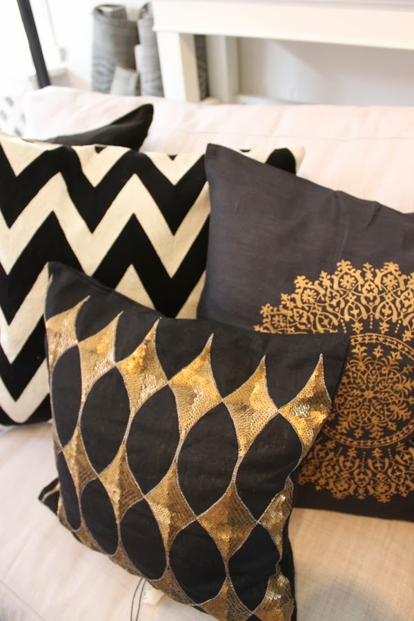 Aber zuerst etwas Wohninspiration.. bin ja eine grosse Liebhaberin von Kissen, allerlei Kissen, im Sofa, auf dem Boden und auf dem Bett. Im Moment hauptsächlich in den Farben schwarz und weiss. Aber warum nicht mit Goldfarbe mischen? Sieht unglaublich toll aus und die Goldfarbe verleiht etwas Wärme zu den Nichtfarben und passt schön zum Holzboden.