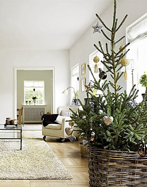 Habe ja gestern geschrieben, dass morgen erste Advent ist. War natürlich nicht richtig. Bleibt noch eine Woche Zeit um die Weihnachtsdeko im Keller zu finden. Aber nicht desto trotz widmen wir uns heute nochmals das Thema Weihnachten und dem Weihnachtsbaum. Die Bäume gibt es bereits überall zu kaufen (vor einigen Jahren war dies anders, dann musste man anfangs Dezember suchen danach). Obwohl ich meinen Baum erst kurz vor Weihnachten reinstellen werde habe ich mich schon Gedanken darüber gemacht. Es gibt vor allem etwas, was mich an dem Baum nicht gefällt, den hässlichen Fuss wo er drinsteht. So dieses Jahr werde ich mein Baum in einem Korb platzieren, sieht nämlich richtig toll aus (und so als Nebeneffekt kann der Hund nicht so einfach am Baum herum knabbern). Die Dekoration möchte ich am liebsten im weiss und Silberfarben halten. Weiss aber, dass meine Kinder da nicht einverstanden sein werden und ich mich wohl fügen muss. Ist ja auch gut so.
