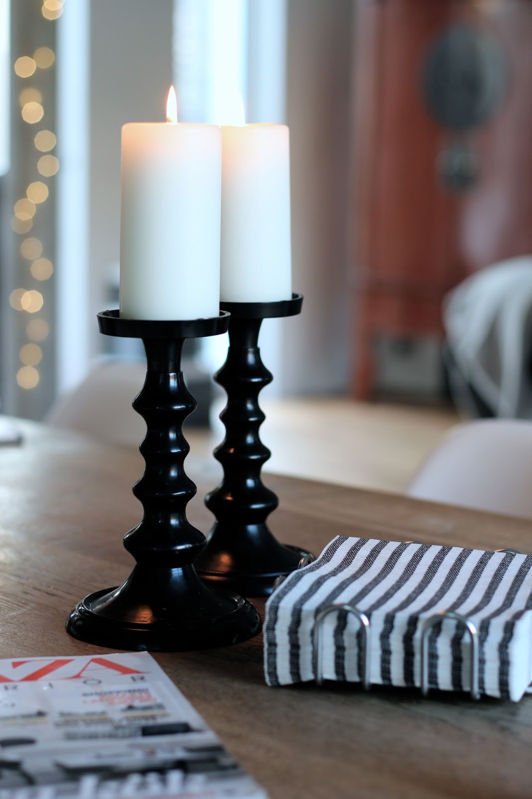 Wie ich schon mehrmals erwähnt habe, bin ich im Moment ein Fan von sogenannten „Nichtfarben“ wie schwarz, weiss und grau in allen Tönen. Sei es Kissen, Servietten, Kerzenständer, Plaids oder Küchenutensilien, alles in schwarz/weiss- und Grautönen. Am liebsten noch gestreift.