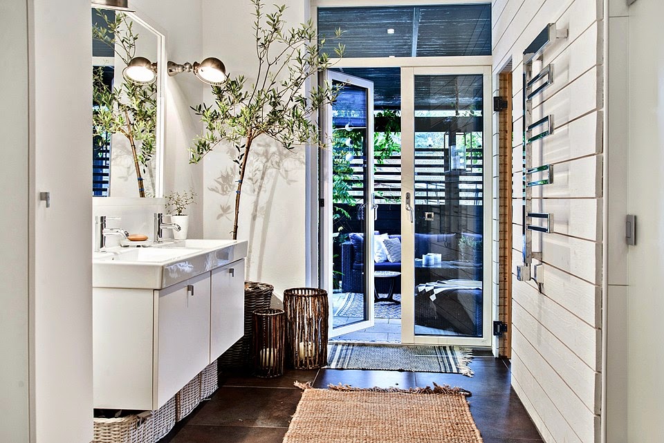 Die Materialwahl und die Farbe weiss hat das Haus grundlegend verändert. Es wirkt viel harmonischer, heller, ruhiger und sieht einfach toll aus! Die Einrichtung ist eine Mischung aus alt und neu, modern und shabby chic mit einem Asiatischem Touch. Die Kupfer Details, die Pflanzen und die Tierfelle geben dem Raum auch die nötige Wärme, als Ergänzung zum vielen weiss. Ein gutes Beispiel von einem sehr gelungenen Umbau!